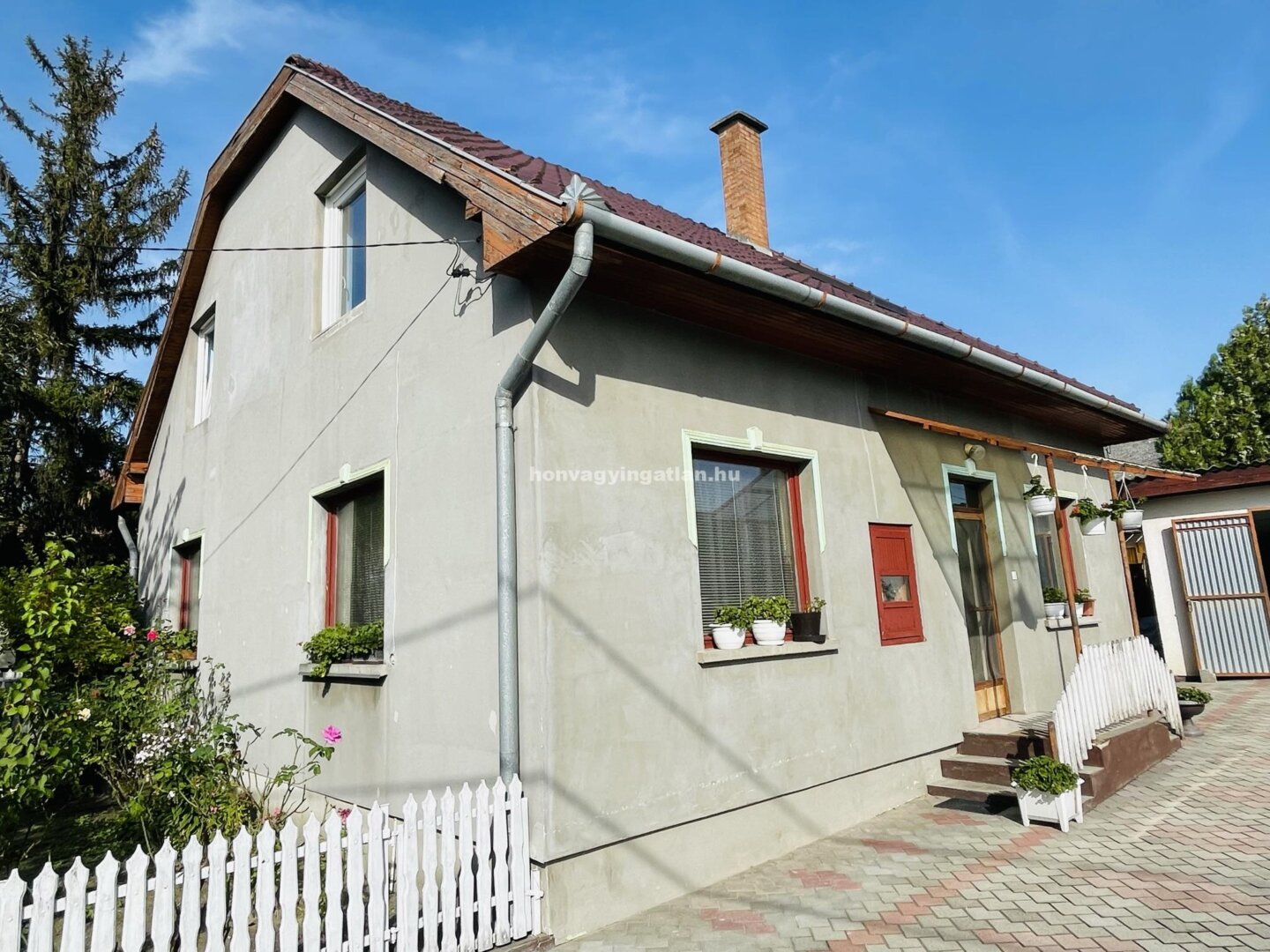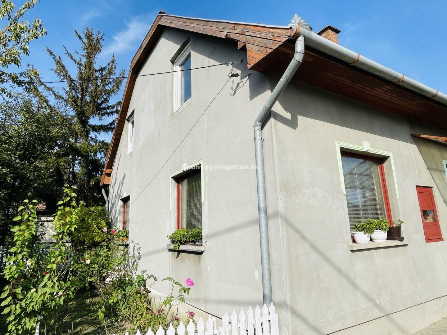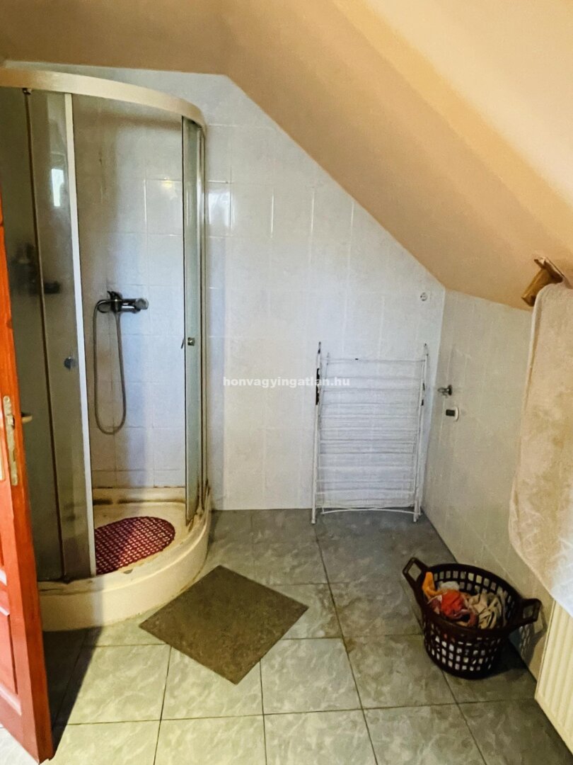 A tetőtér elosztása: 2 szoba, nappali-konyha, spejz, kádas és zuhanyzós fürdőszoba és WC. Az udvaron 2 gk. beállású garázs van alatta pincével. A ház fűtése gáz és vegyestüzelésű kazánról radiátorokkal megoldott.