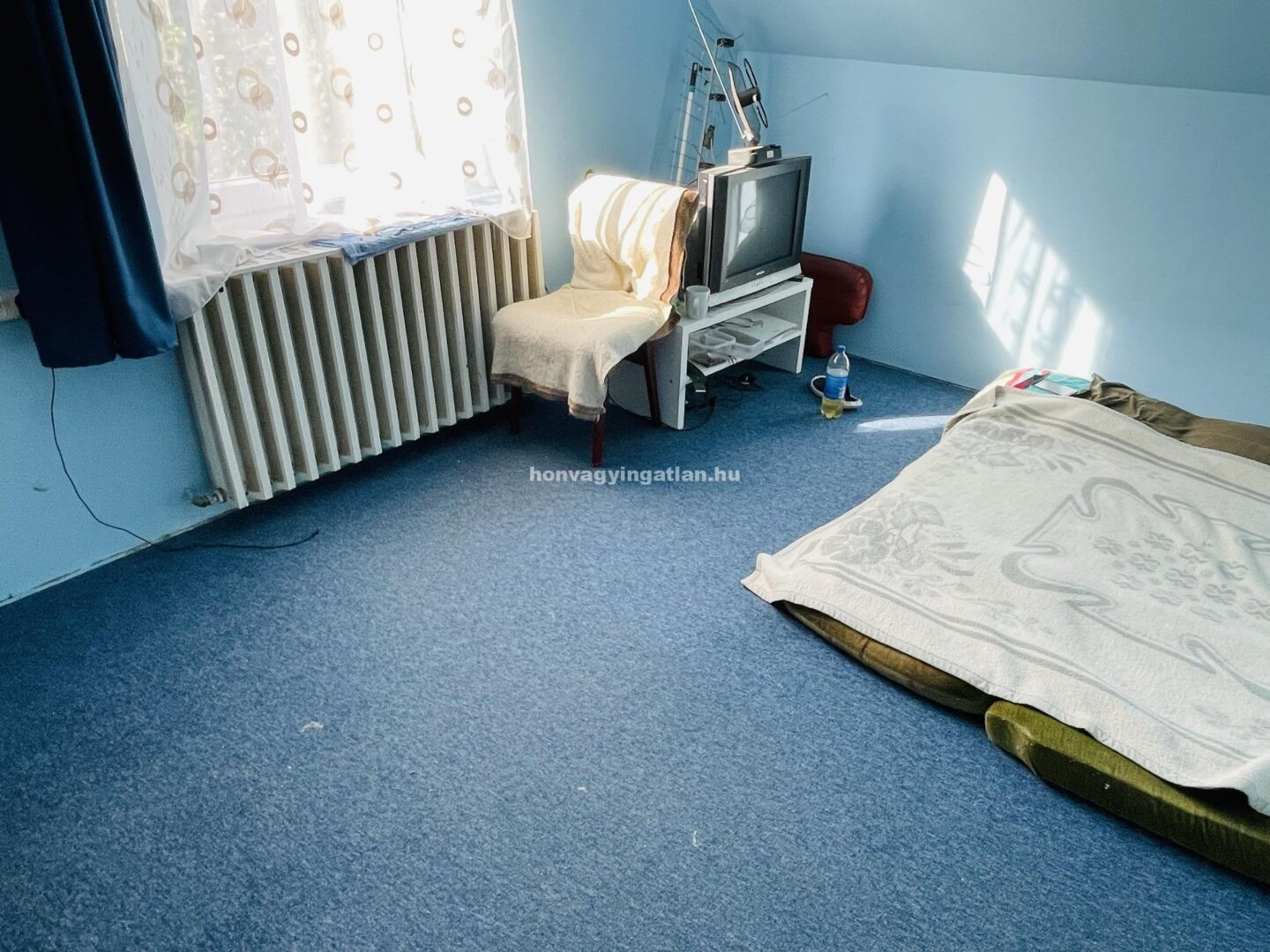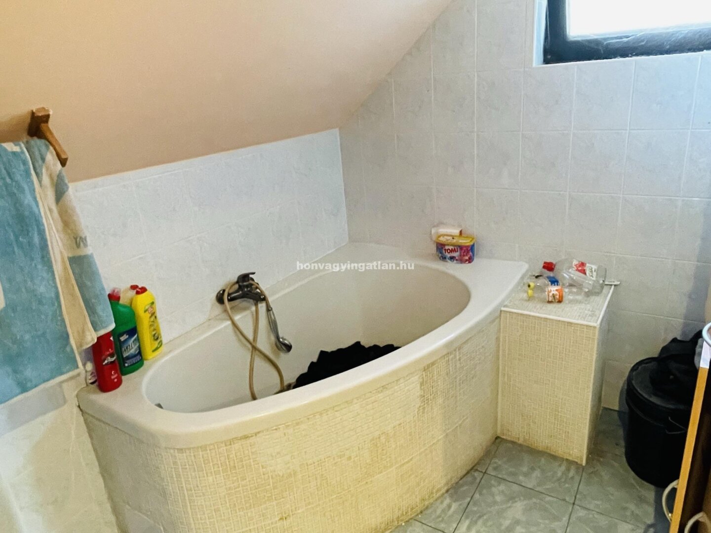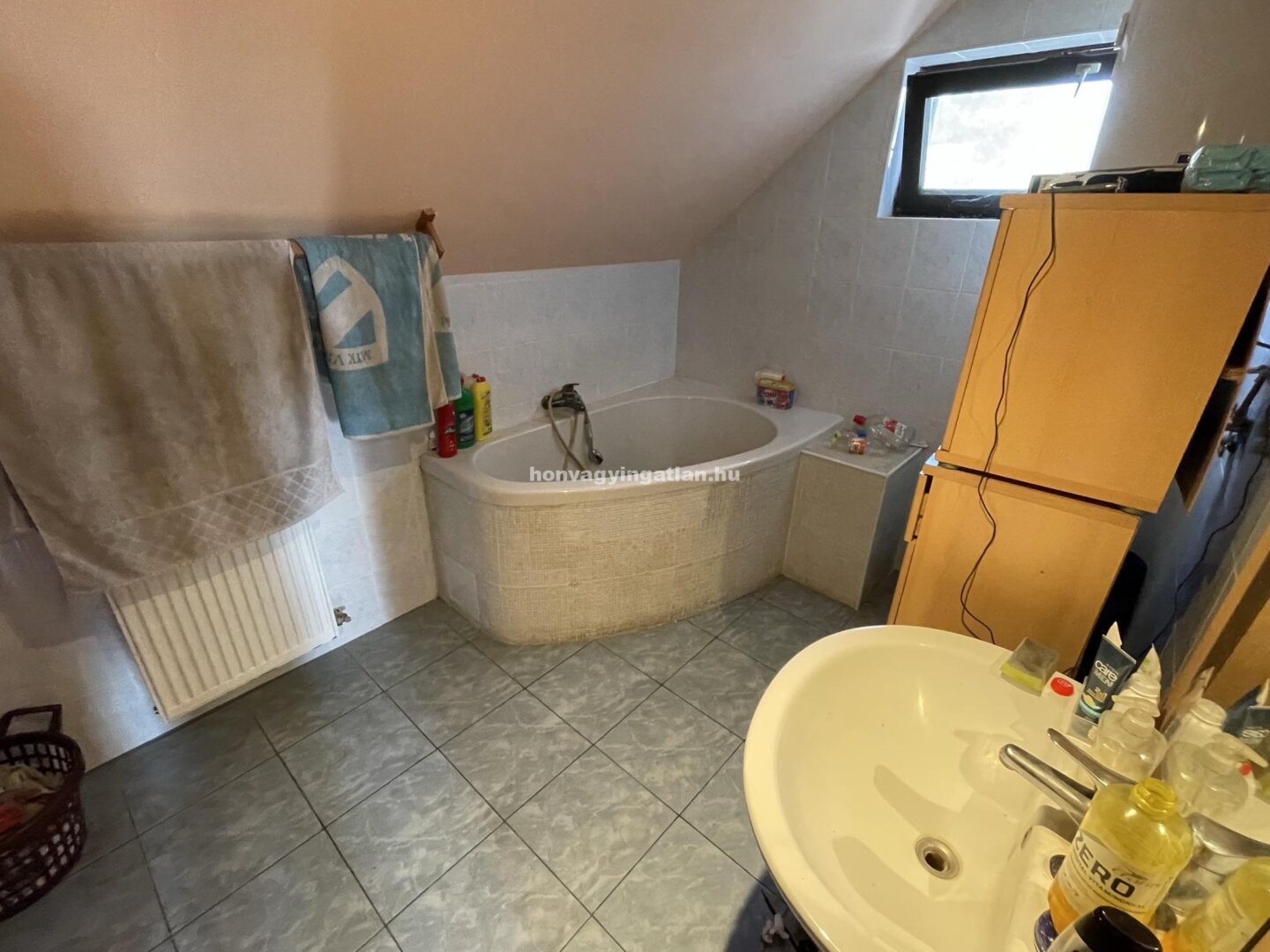 A tetőtér elosztása: 2 szoba, nappali-konyha, spejz, kádas és zuhanyzós fürdőszoba és WC. Az udvaron 2 gk. beállású garázs van alatta pincével. A ház fűtése gáz és vegyestüzelésű kazánról radiátorokkal megoldott.