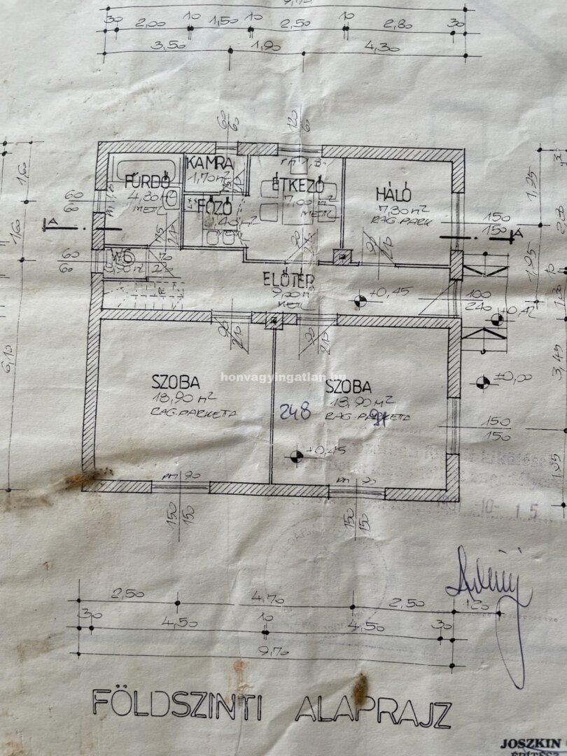 A földszinten 3 szoba, konyha, spejz ,zuhanyzós és kádas fürdőszoba, WC és közlekedő folyosó van.